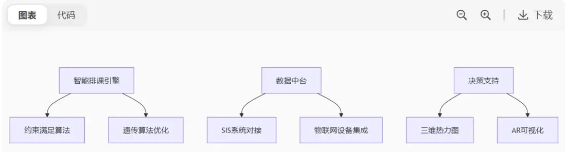 | 可視化交互 | 課表查看 | 拖拽調整+衝突實時提示 | 3D教室導航 |