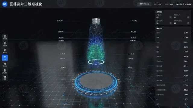 圖撲 HT 三維場景內支持操作人員實時觀察原料從布料器精準拋灑至高爐內部的動態過程,通過 HT 3D 技術清晰追蹤礦石、焦炭等不同原料的落點位置與料層堆積形態,確保原料分佈狀態可實時監控。