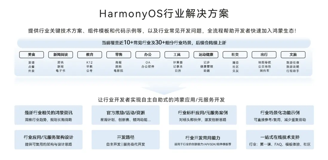 HarmonyOS行業解決方案為開發者提供行業應用高頻使用的 API、組件、模板及 SDK 等接入方案
