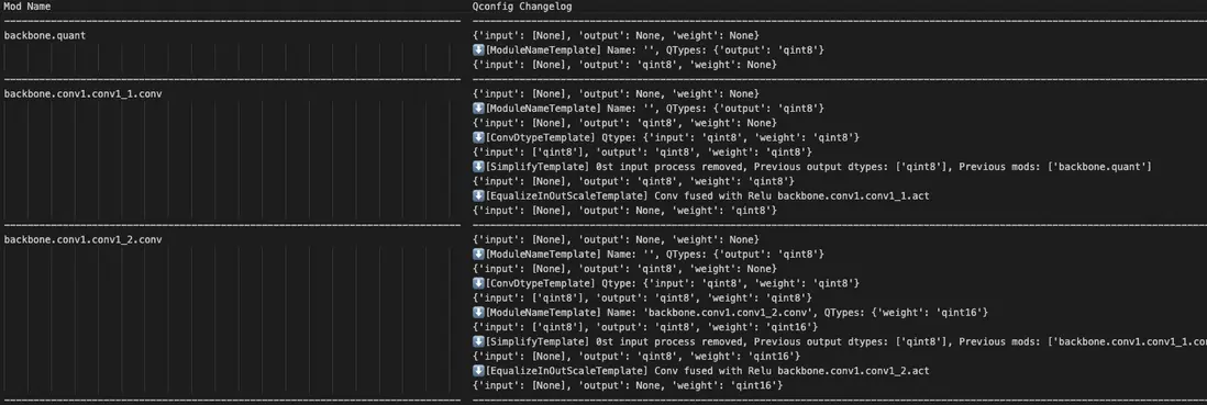 qconfig_dtypes.pt、qconfig_dtypes.pt.py以及qconfig_changelogs.txt。其中,qconfig_dtypes.pt為可供用户加載的算子級別的量化配置文件,實現了配置的便捷遷移與共享;qconfig_dtypes.pt.py則以 Python 腳本形式保存配置信息,便於用户查看;qconfig_changelogs.txt則記錄了配置過程中的算子變更日誌,包括量化參數調整記錄、模板使用信息等,為配置的追溯、調試提供了清晰的依據,進一步提升了量化配置的可解釋性與可複用性。