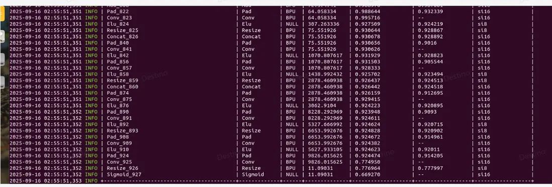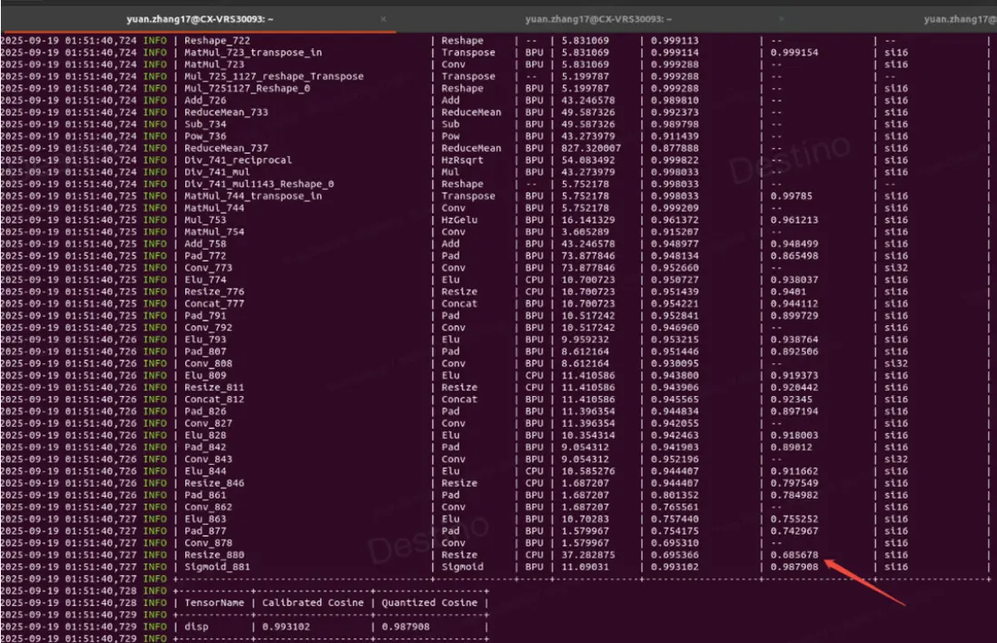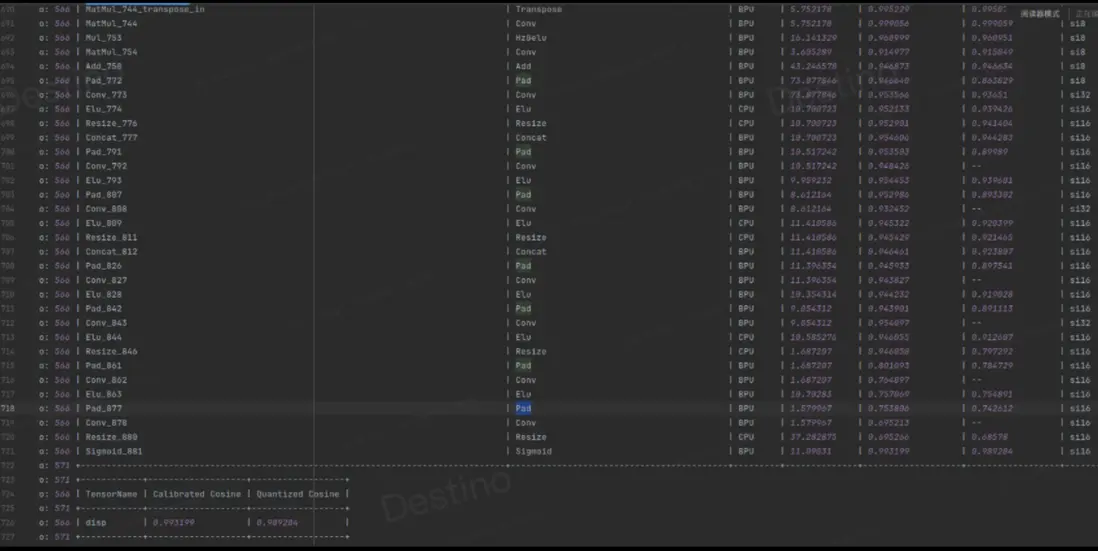 如圖 2,基於全 int16 算子配置量化,當前版本 resize 算子有約束(請查閲工具鏈算子支持情況),只能支持 int8 量化,即使配置了 int16,但算子依舊退化到 int8,因此算子的 cosine 相似度也比較低,基於此閾值,max\_qscale=6653/127=52.385,此 scale 過於大,並不能精細化量化模型,所以全 BPU 算子的整體精度都不高。