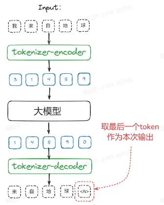 大模型的輸入是由數字組成的張量,而非自然語言字符。自然語言通過 tokenizer(可以理解為一種詞典)映射到詞典的頁碼數字 ID,進行輸入計算。得到的輸出數字再利用詞典進行解碼,重新得到自然語言。