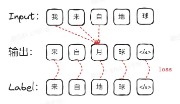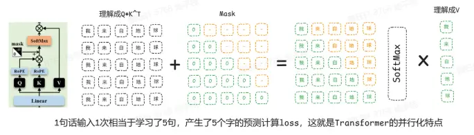 那麼,它是如何學習的呢?在自注意力機制中,通過為 qk 增加掩碼,softmax 後將負無窮對應到 0,隱藏掉 n 字符以後的內容。這樣,輸出的第 n+1 個字符只能關注到前 n 個字符,如同戴上了一副“只看過去”的眼鏡。