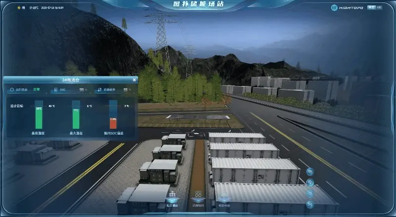 圖撲 HT 儲能運維管理平台通過實時數據採集和 3D 可視化,實時監測電池艙、升壓變流艙等運行參數並直觀展示,還可藉助歷史數據追溯分析潛在故障、及時預警,同時提供設備操作控制與充放電管理功能。