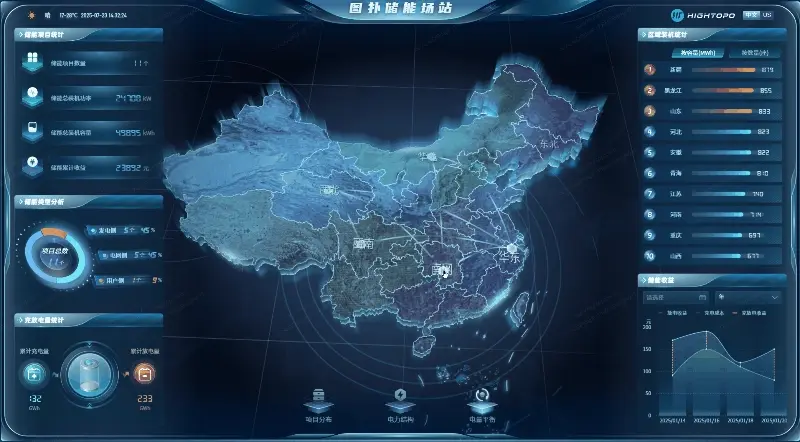 案例首頁展示了圖撲儲能場站的各類關鍵信息。包括儲能項目統計,如項目數量、總裝機功率等;儲能類型分析,含發電側等項目佔比;充放電量統計及區域裝機統計等。同時展示了儲能收益相關情況,整體通過數據和圖表直觀呈現儲能系統運營狀況。