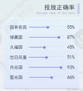 當日各小區投放量:主要統計乾濕垃圾、有害垃圾、可回收垃圾的各小區總重量和佔比統計;正確投放率:直觀體現出各小區的垃圾分類投放率高低,側面分析出不同小區物業管理的情況。