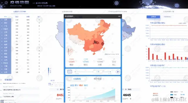 確診數據: 展示了最新的確診,疑似,治癒,死亡等數據,點擊時間軸播放按鈕,動態展示歷史數據,與旁邊的色卡對比能清晰地觀察出各地區疫情的嚴重程度。