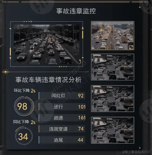 實時展示高峯期車速分析數據,同步預測未來時間內的交通擁堵情況。在違章事故方面,HT 可視化還加入了全城各位置多畫面視頻監控,幫助管理者對重點道路、車輛、事故等進行實時監測。