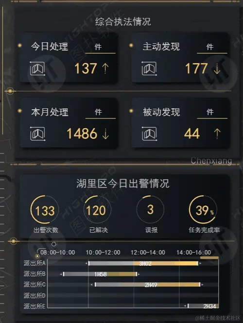 直觀展示案件數量、案件種類、完成數量、出警類型在內的實時數據,同時支持查看各區域正在執行的任務,可以大幅度提高指揮調度效率、增強處置突發事件的能力。
