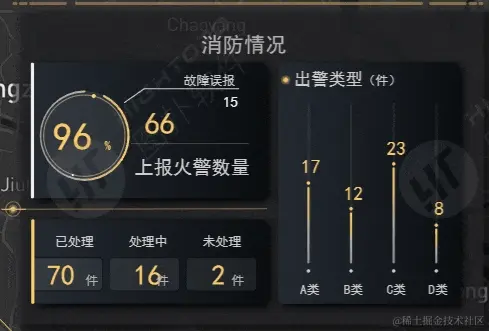 通過火警類型統計、實時上報數量、處理類型統計等幾種數據幫助消防部門及時對火情作出決策,將人員財產損失降到最低。