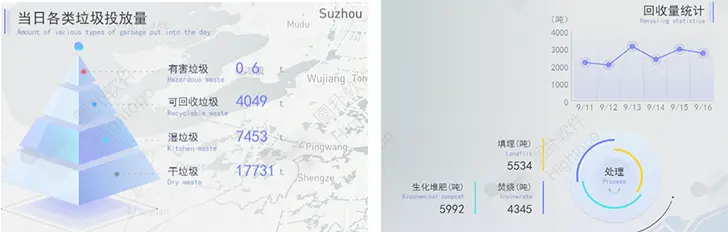 將智慧監控數據、傳感設備數據接入圖撲軟件可視化大屏,可在垃圾分類處理控制中心查看當日全市垃圾投放總量和垃圾回收率。通過可視化大屏的信息統計,再結合大數據、雲計算等技術可獲得垃圾管理社會成本,實現精細化管理和降本增效。
