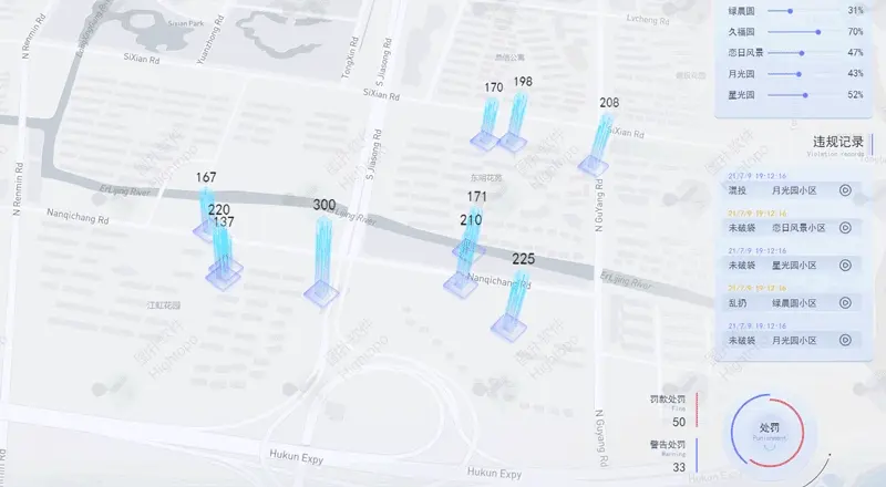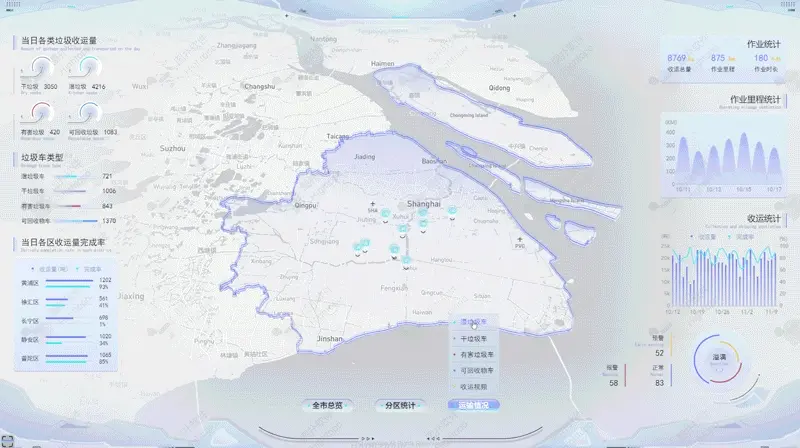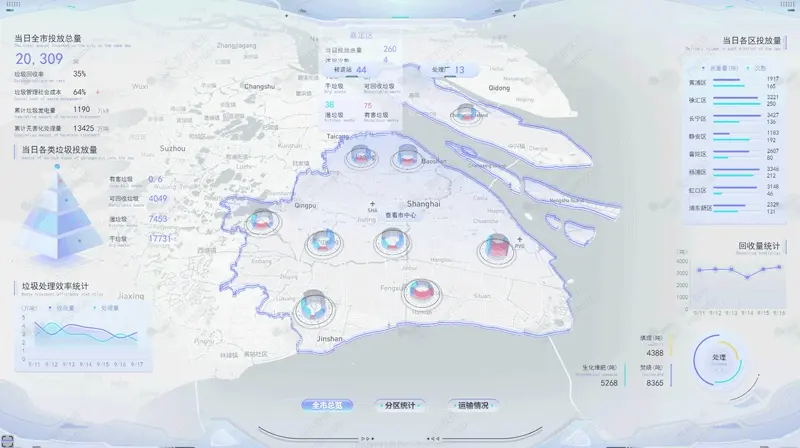 通過 Hightopo 自研引擎結合 GIS 實現上海市地圖的精確還原。GIS 引擎,能夠與 3D 場景準確同步。將上海市 16 個區的垃圾分類情況分別統計,有針對性地進行查看。2021 年下半年度上海全市 16 個區和 220 個街鎮的生活垃圾分類實效均達到“優秀”水平。各區中,嘉定區、楊浦區考評成績穩居前兩名。