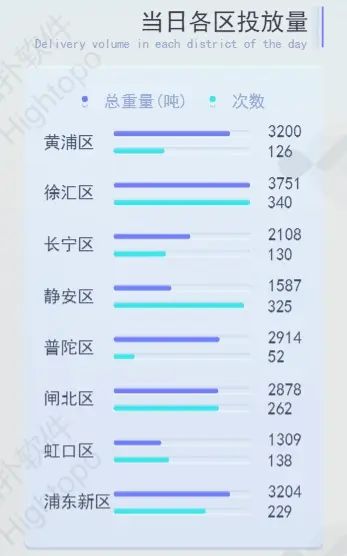圖撲軟件可視化大屏能接入智能設備的實時數據,並通過不同類型的圖表形式展示黃浦區、徐彙區、長寧區等不同區域的投放量和投放次數。