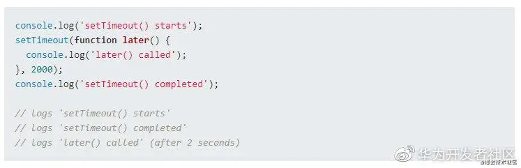 later() 是一個異步回調,因為 setTimeout(later`,`2000) 啓動並完成了執行,但是 later() 在 2 秒後執行。