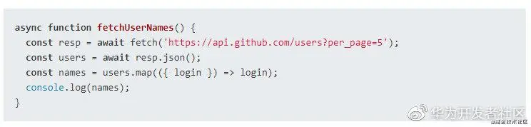 fetchUserNames() 是異步的,因為它以 async 為前綴。函數 await fetch('https://api.github.com/users?per_page=5') 從 GitHub 上獲取前5個用户 。然後從響應對象中提取 JSON 數據:await resp.json()。
