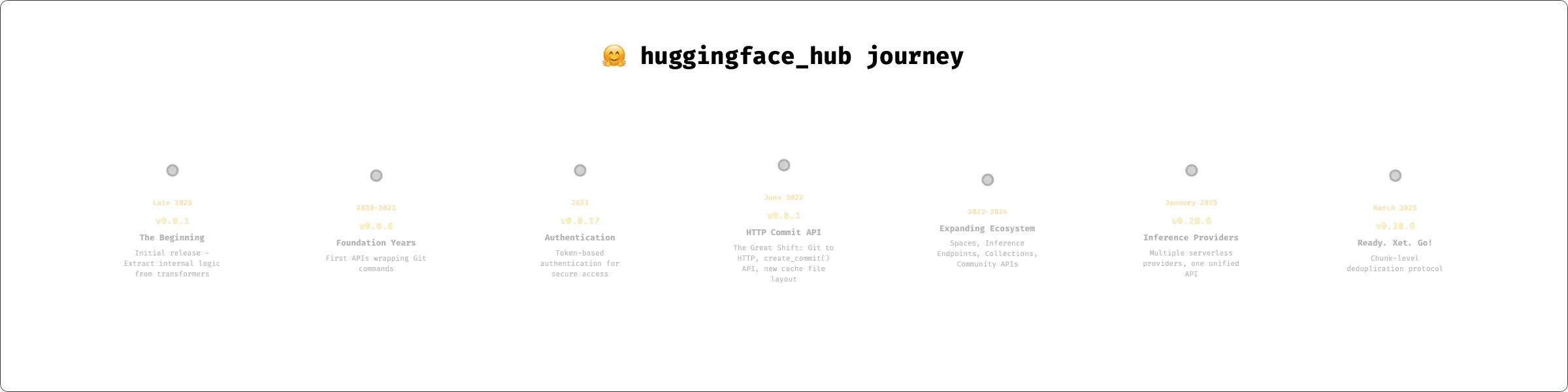 直到 2020 年底,我們推出了 huggingface_hub 的首個版本 v0.0.1,它的初衷是:將原本封裝在 transformers 庫中的內部邏輯獨立出來,構建一個專用庫,用於統一訪問和共享 Hugging Face Hub 上的機器學習模型與數據集。最早的版本非常簡潔,它只是一個 Git 操作的封裝工具,用於下載文件和管理倉庫。但五年過去,歷經 35+ 個版本迭代,huggingface_hub 已遠遠超越最初的設想。