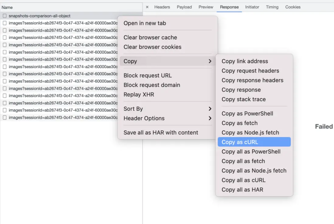 - 【解決方案】:右擊url,找到Copy as cURL,並在命令的結尾加上“>> 1.txt”,可以將response結果直接輸出到文件,而不是命令行,方便複製。