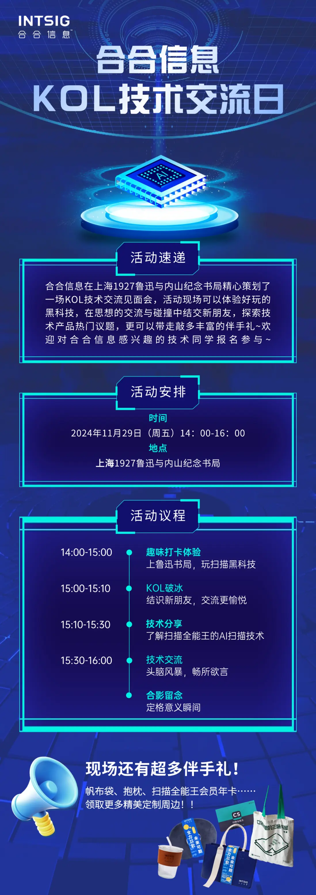 快到年終啦,合合信息打算和上海的新老朋友進行一場零距離聚會!我們在上海1927魯迅與內山紀念書局精心策劃了一場技術交流見面會,活動現場可以體驗好玩的黑科技,在思想的交流與碰撞中結交新朋友,探索技術產品熱門議題。參會還可帶走敲多豐富的伴手禮~ 詳細活動安排請戳下圖,點擊合合信息KOL線下活動報名 即可報名,報名成功後我們會有專人聯繫。歡迎對合合信息感興趣的開發者朋友們報名積極參與,期待在現場與您相見~