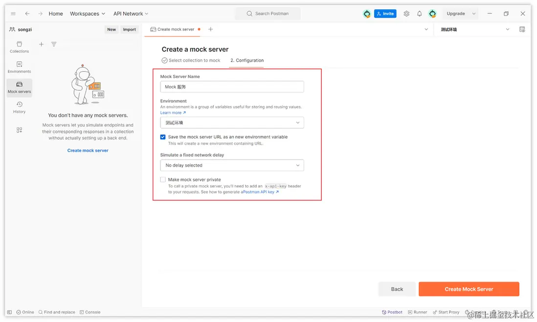 之後,給你的 Mock Server 命名,選擇一個測試環境,並決定是否將此 Mock Server 的 URL 設置為一個新的環境變量。所有設置確認無誤後,點擊【創建 Mock Server】完成創建過程。