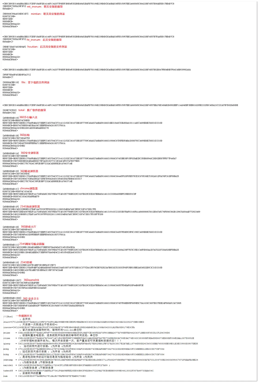 在kmsactivation.exe模塊中,首先從hxxp://qfxzq.tyd28.com/0406jh/info_online_mh.txt獲取惡意配置信息,再根據惡意配置信息來執行特定的惡意行為,如:下載、執行任意文件,後台靜默安裝軟件等。相關惡意配置信息,如下圖所示: