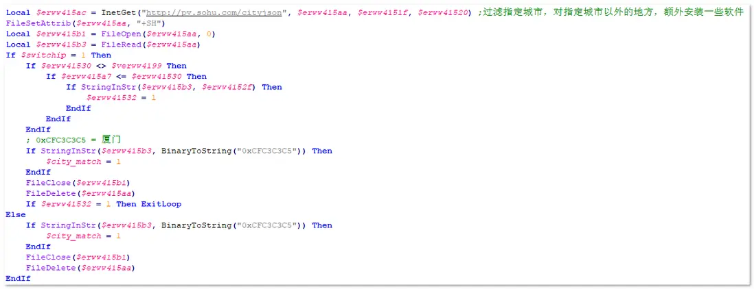該模塊還會過濾指定城市,對指定城市以外的地方,額外安裝一些軟件(騰訊電腦管家),獲取用户當前所在城市。相關代碼,如下圖所示: