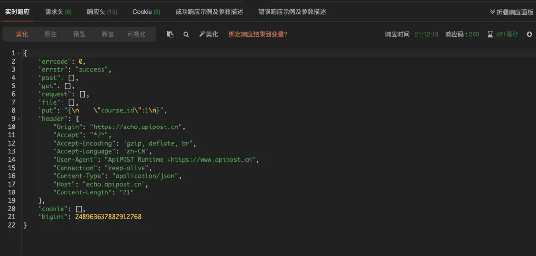 你可以查看返回數據,返回Header、Cookie、狀態碼、請求時長等等數據。