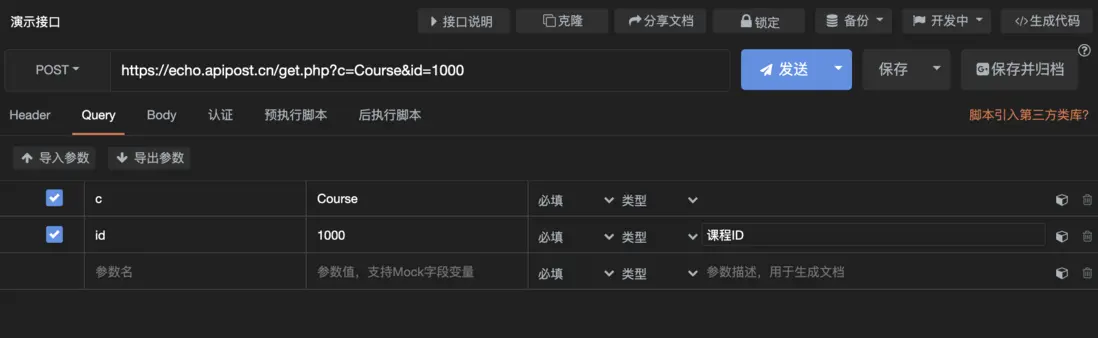 curl --location --request POST 'https://echo.apipost.cn/get.php?c=Course&id=1000' \