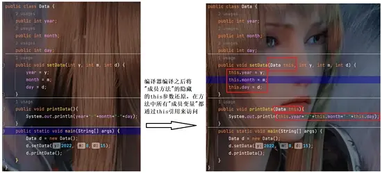 - this引用是成員方法的參數之一,不需要用户傳遞實現,由編譯器自動完成,也就是説,這個參數用户是看不到的,但用户可使用這個參數。