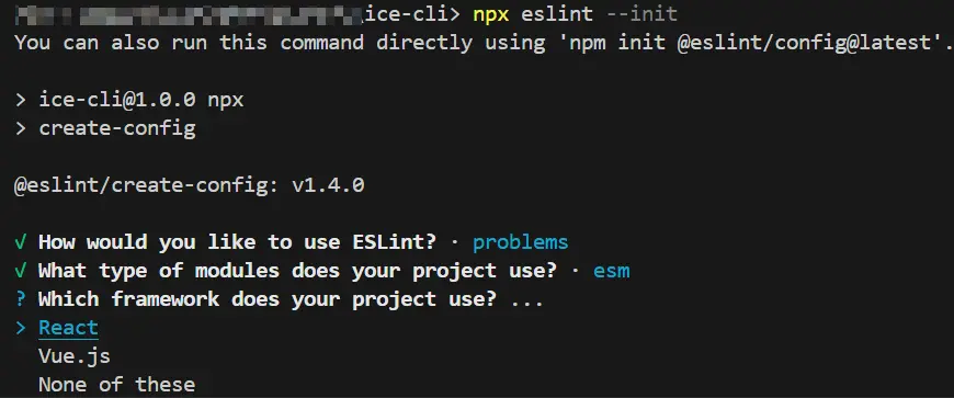 eslint初始化過程中會提出的問答,如 "Which framework does your project use?"。常用的交互式命令行庫有inquirer。