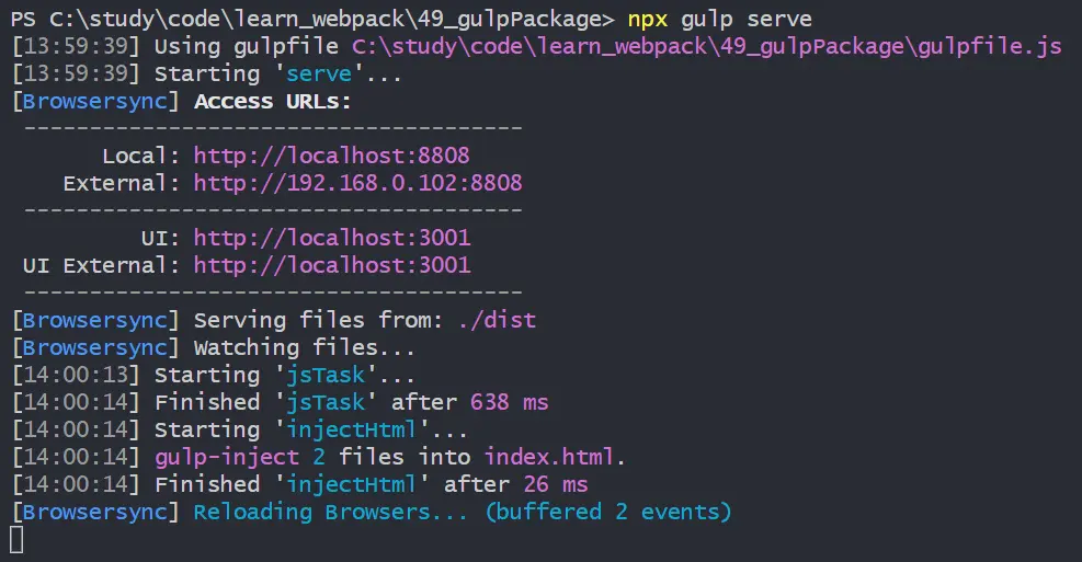 這樣只需要導出兩個任務,就可以覆蓋 編譯 和 開啓自動服務 兩個場景,還可以在 package.json 中配置 script 命令,就可以直接通過 npm 來執行任務,執行 npx gulp serveTask