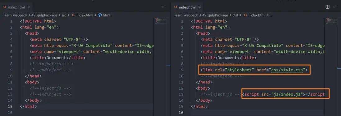 gulp-inject` 幫助編譯,並在模板 html 文件中添加魔法註釋,告知資源引入的地址。