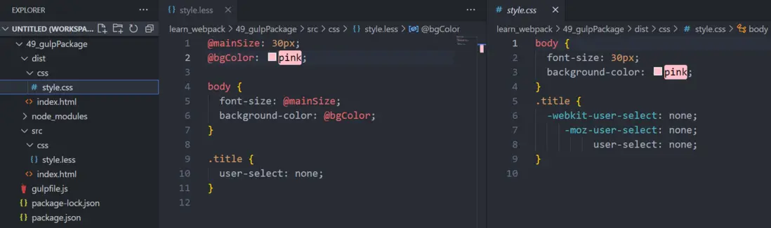 執行 npx gulp lessTask,less 文件會被處理成 css 文件