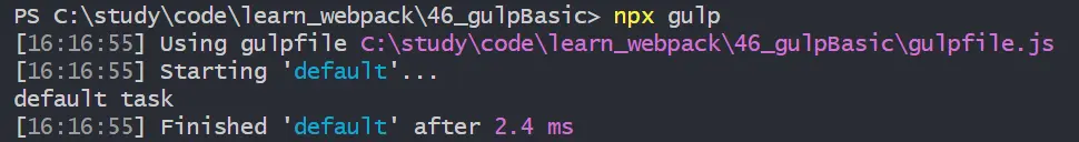 上面執行命令時,gulp 後面跟了任務名稱 foo,如果不跟名稱時,執行的是默認任務,需要在 gulpfile.js 中導出默認任務