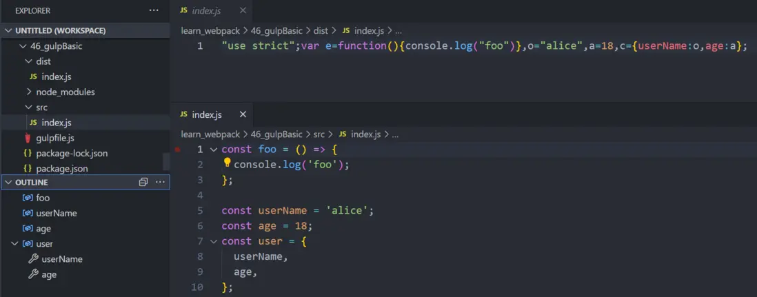 此時的 js 代碼沒有做 es6 - es5 的轉化,也沒有壓縮,想要達到這些效果,需要使用 gulp 的插件,分別是 gulp-babelgulp-terser,定義方式和 webpack 中 babel 和 terser是一致的,不太瞭解 babel 和 terser 的朋友可以點鏈接查看。