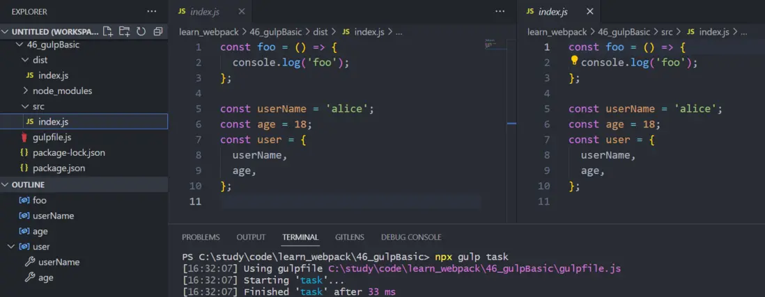 執行 npx gulp foo 命令編譯任務,在 gulp 後面跟上函數名 foo 告知執行的任務名稱