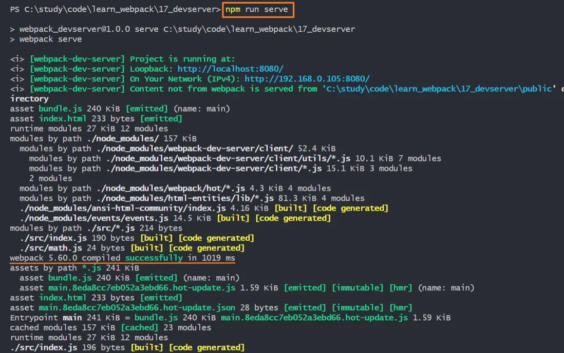 npm run serve 執行命令,編譯完成後也不會終止進程,當文件更改後會再次重新編譯