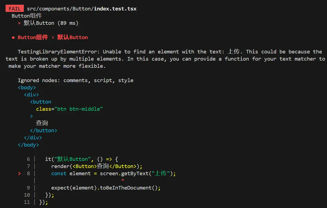 當我們將 const element = screen.getByText("查詢"); 中的字符串 查詢 改為 上傳 時,會立馬給出錯誤信息。