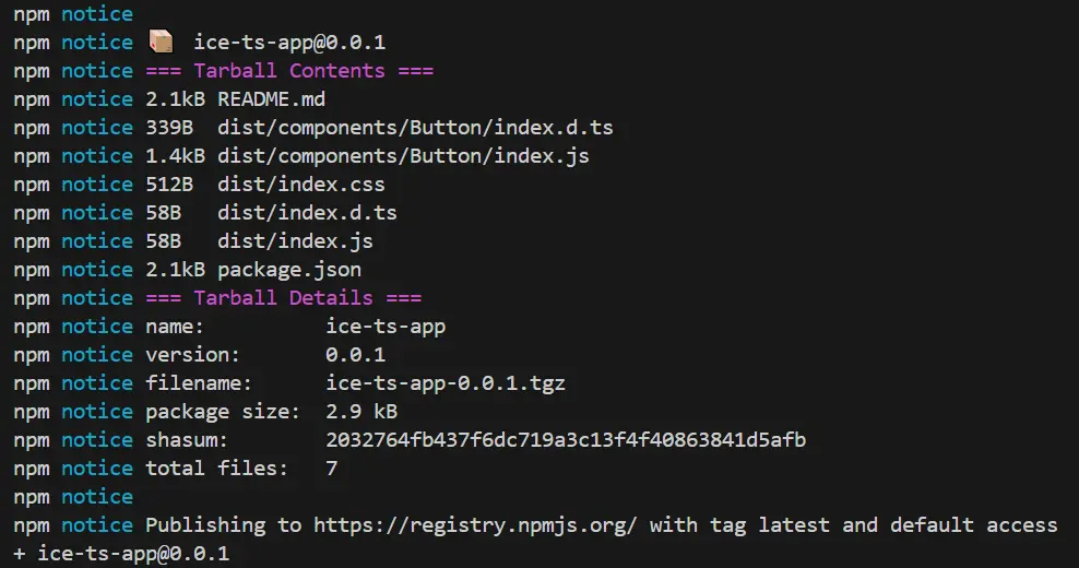 發佈之前先在 npm 倉庫 上登錄,然後執行 npm publish ,可以看到發佈日誌中有我們提交的文件名稱、文件大小,版本號等信息。