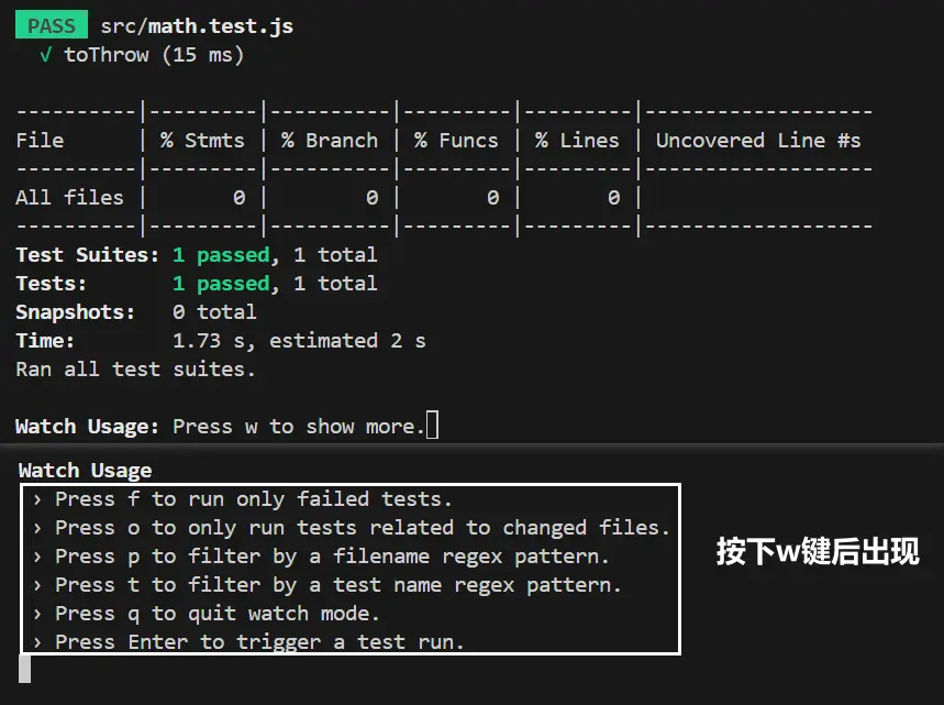 在命令行中,你會實時看到當前測試用例的執行結果。同時,Jest 還提供了一些快捷配置,按下 w 鍵即可查看具體有哪些指令。