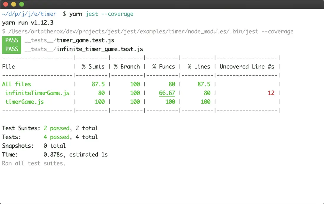 通過 npm run test 執行 Jest 運行指令,可以在命令行工具查看詳細的測試信息,包括哪個文件的哪條測試用例的狀態,以及簡易的測試覆蓋率報告。