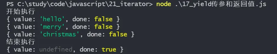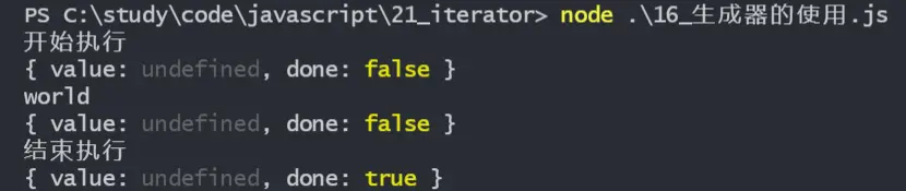 調用next方法時,返回值與迭代器一致,為包含 value 和 done 的對象,此時value為undefine,因為yield後沒有加上返回值