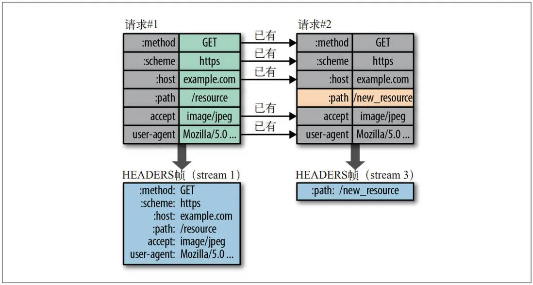 客户端和服務器緩存上一次的請求,只發不同的請求頭,靜態表儲存着常用請求頭,動態表是隨着新的請求增加新的請求頭,客户端和服務器同步保存兩張表,一個頭信息對應着一個索引,如果請求頭存在於索引表中,只需發索引號。