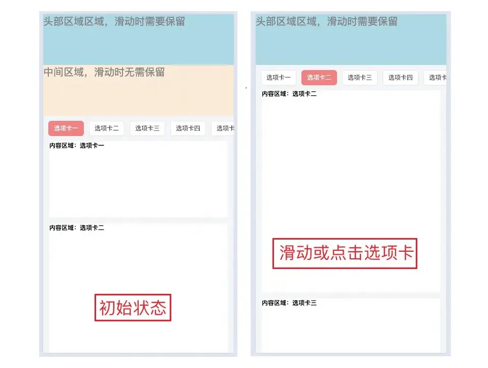 產品要求在h5頁面實現集錨點、吸頂及滑動高亮為一體的功能,如下圖展示的一樣。當頁面滑動時,內容區域對應的選項卡高亮。當點擊選項卡時,內容區域自動滑動到選項卡正下方。