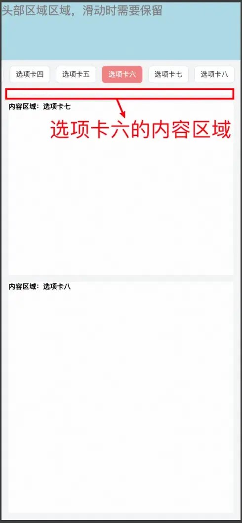 具體代碼如下,這樣就能實現向上滑動時,選項卡一整行固定在頭部區域和內容區域之間。