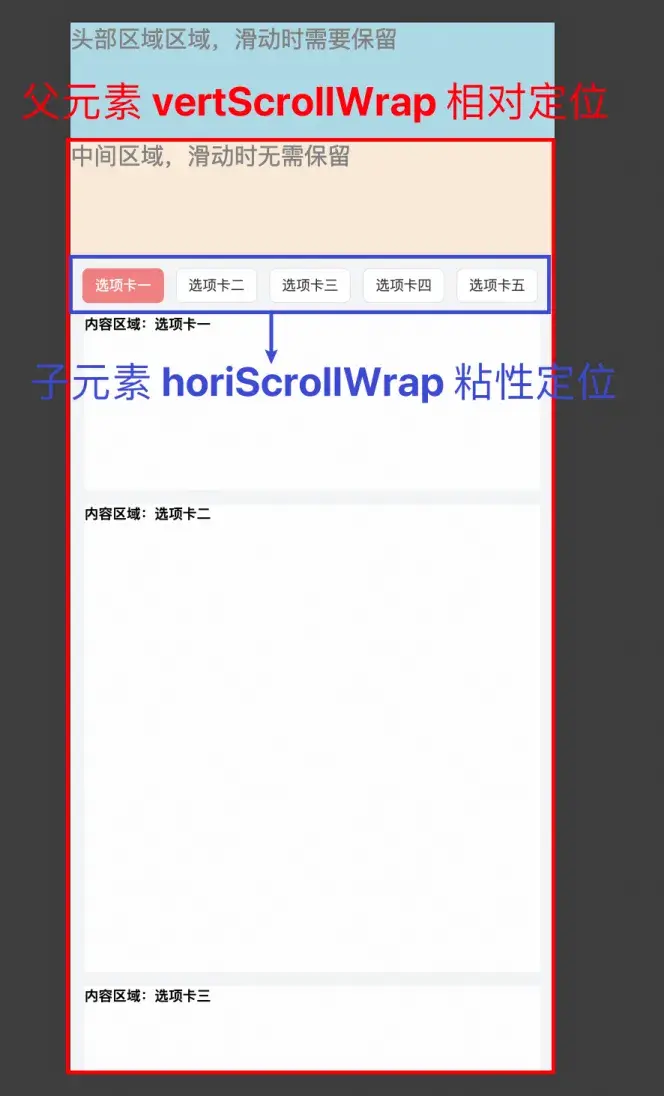 按照這個場景,首先把選項卡橫向滾動及吸頂的功能實現。這裏代碼語法很簡單,通過 position: sticky 就能實現,但需要注意的是,這裏的 dom 元素佈局很重要,父元素需要包裹滑動時無需展示的中間區域,以及選項卡、及裏面的內容區域。