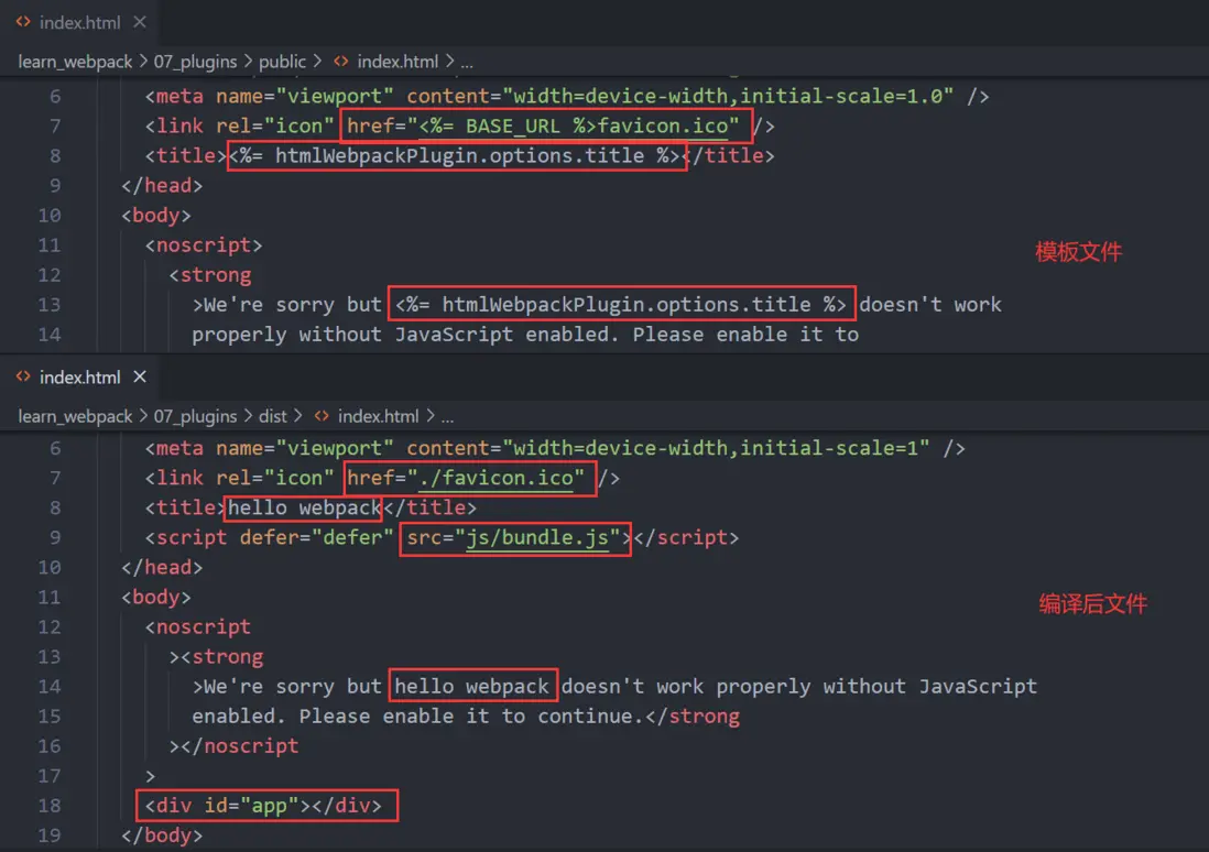 但比如 vue、react 的入口 index.html 文件中需要添加 id 為 app 或者 root 的 div 標籤,使用默認的 html 模板就不合適了,html-webpack-plugin 提供了自定義模板文件的選項。