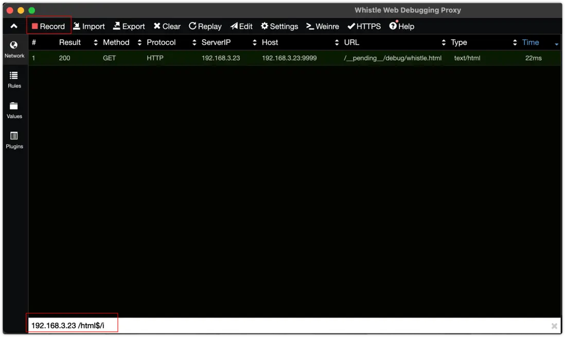 當正在抓包時左上角的Record會顯示紅色,此時whistle會將所有的請求抓取到中間面板列表
