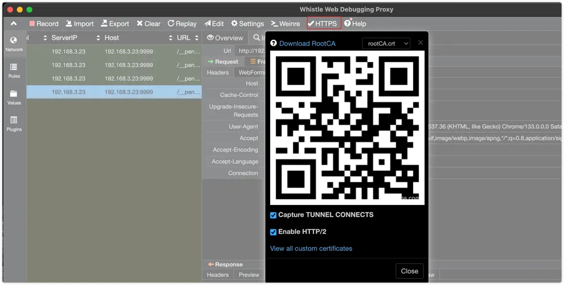 和主機HTTPS抓包道理一樣,如果手機要能信任代理人,就必須在系統中植入whistle的證書;那麼使用whistle可以很方便的安裝證書到手機中